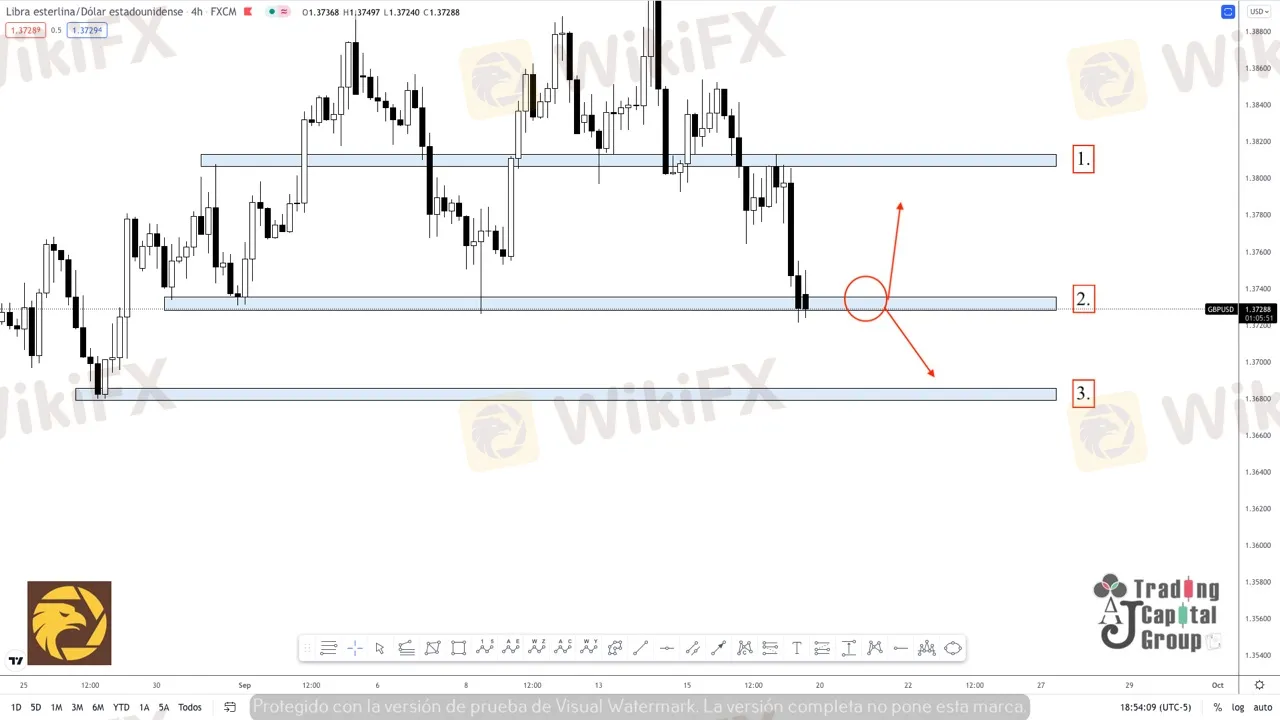 2. De romper por debajo d los 1.37288 el siguiente punto de llegada del precio, sería la zona de los 1.36800 (3) debido a que fue el ultimo nivel de participación alcista en la que el precio se consolido, esta proyección se daría de crear una vela en venta por debajo de esta zona. Sin embargo, de frenar completamente la caída del precio, esta zona tendría la posibilidad de impulsar el precio hasta recuperar nivel de compra y crear un alto mas bajo.