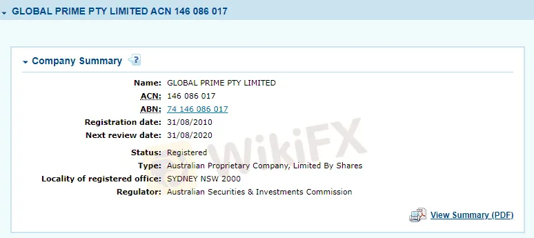 Global Prime está autorizado por ASIC de primer nivel y posee una licencia AFSL con un entorno comercial de bajo riesgo.