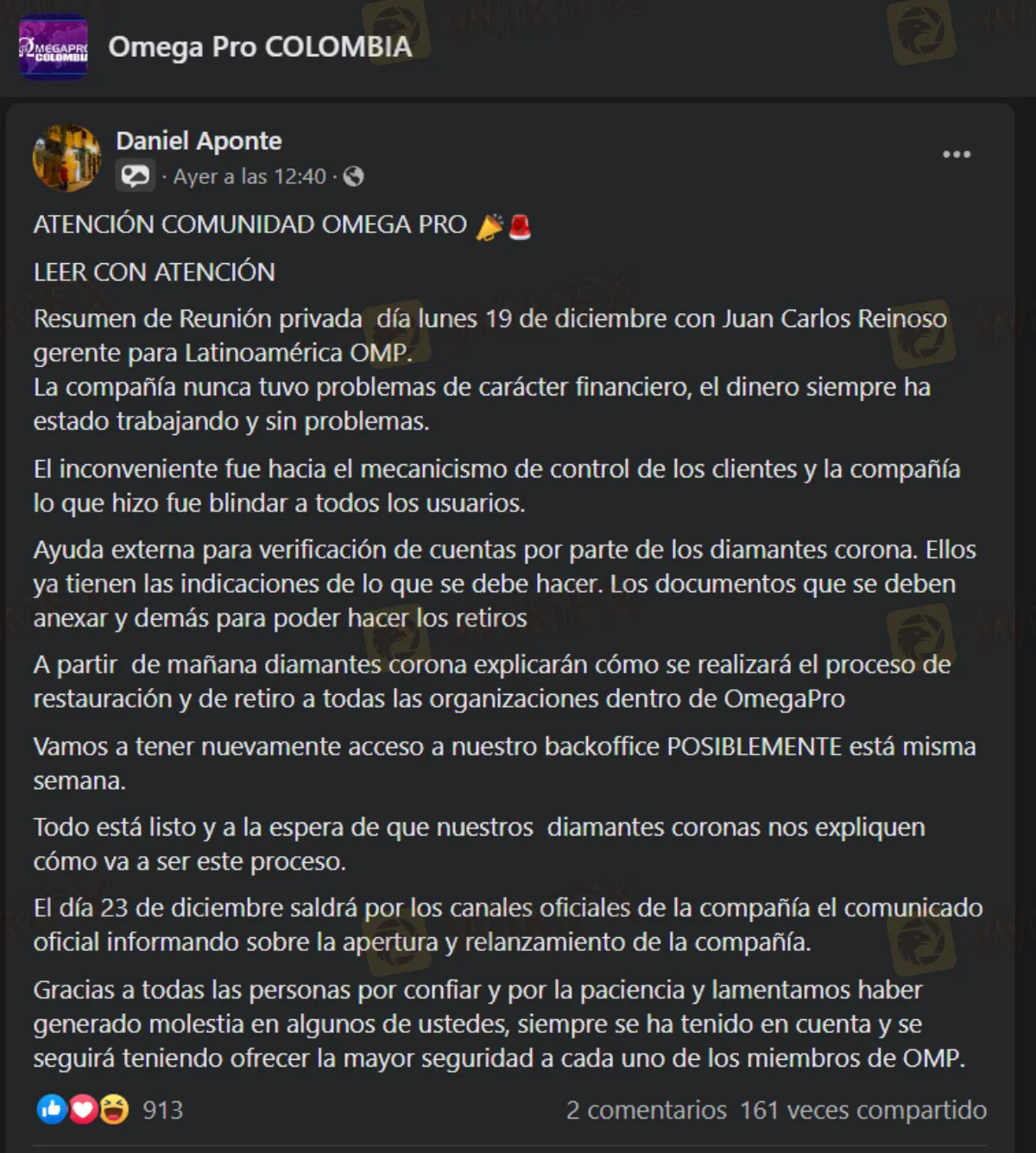 En una reunión privada llevada a cabo por Juan Carlos Reynoso, gerente de OmegaPro para Latinoamérica y los Diamantes Corona del corporativo, se anunciaron a estos las medidas tomadas por la empresa en busca de salvaguardar los fondos y la información de los clientes.
