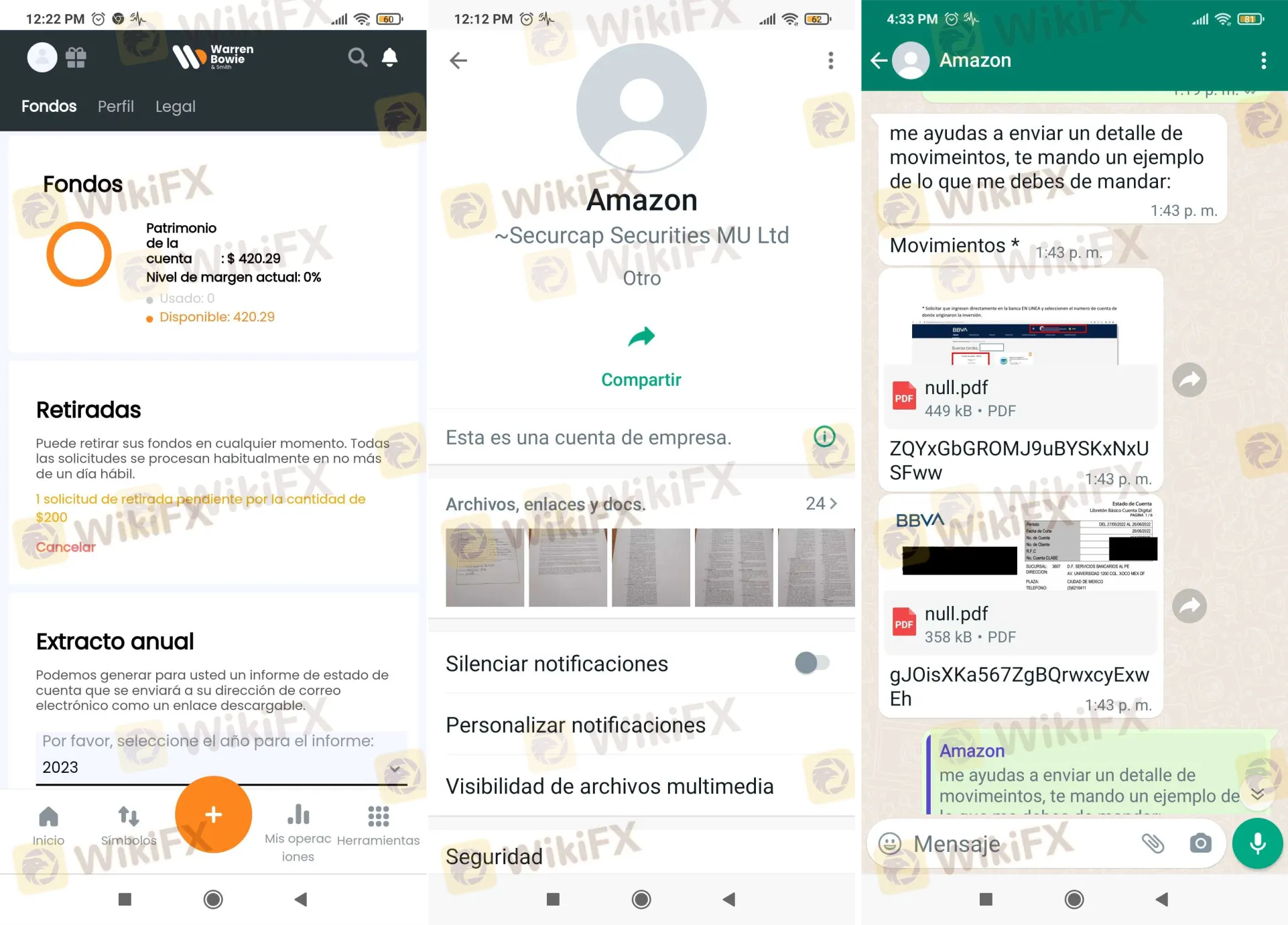 “Invertí en Warren Bowie & Smith a través de una plataforma de inversión y llevo más de 10 días esperando la devolución de mi dinero y no me contestan. Invertí 200 dólares, que es lo que me pidieron, pero solicité una devolución y me dijeron que demoraba entre 5 a 10 días hábiles y ya pasó más de ese tiempo, los correos no existen y el número que puse en las imágenes ya no me contesta. La vez que me contestaron me pidieron datos personales. Pido me ayuden con la recuperación de mi dinero de favor”.