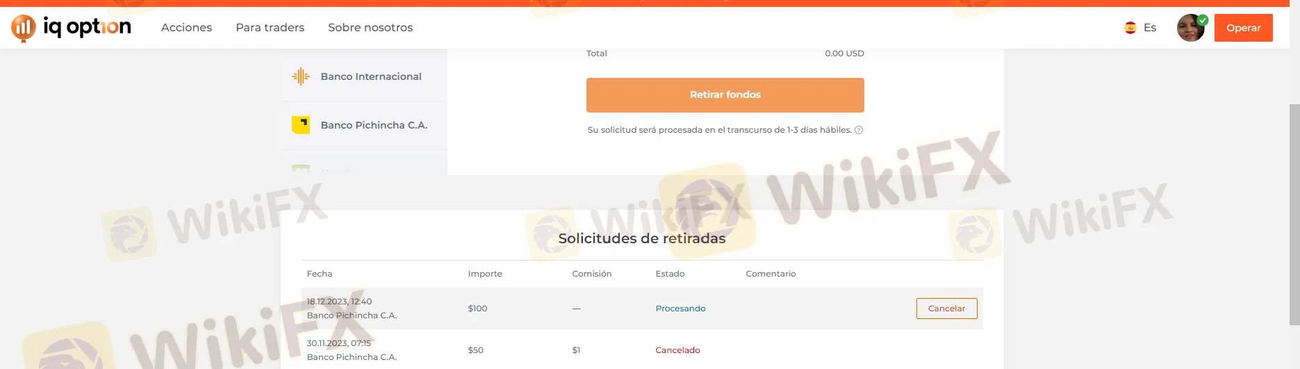 El inversor revela un historial de altibajos en su relación con IQ Option. A lo largo de dos años, había depositado y retirado fondos en varias ocasiones, incluso habiendo perdido dinero en algunas ocasiones. No obstante, ahora que finalmente estaba obteniendo ganancias y deseaba retirar modestos 100 dólares, se encontró con un obstáculo insospechado.