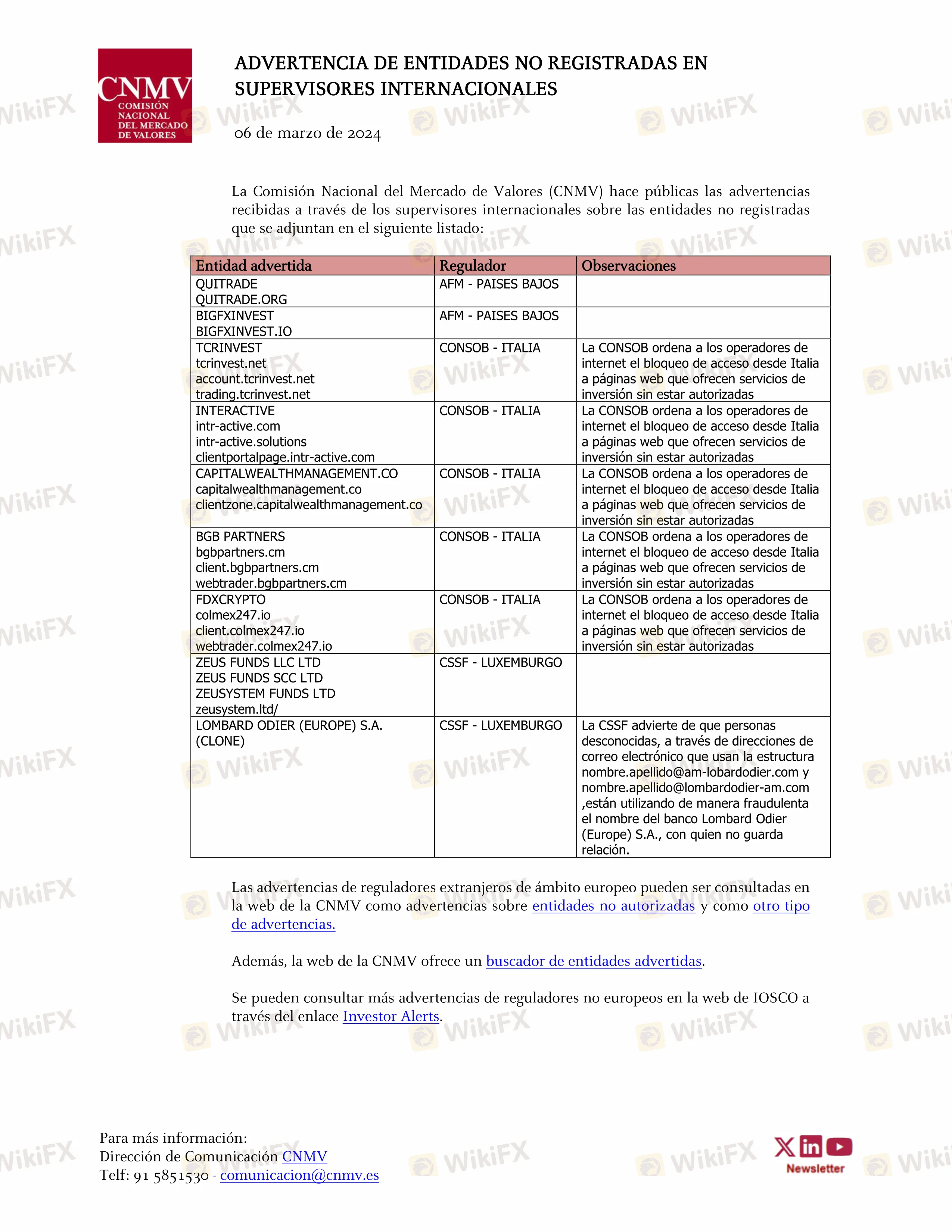 Cabe anotar que la advertencia emitida sobre estas entidades no solo influye a España, influye a nivel global ya que dichas entidades por lo general actúan con la misma irregularidad sobre otros territorios y afectan a inversores de todo el mundo.