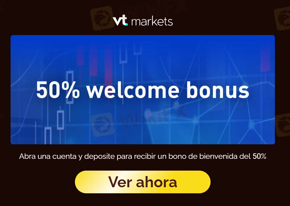 El broker australiano VT Markets sorprende a sus clientes nuevos con un bono de bievenida del 50 % del valor de su depósito inicial, sólo debes registrarte, depositar al menos 500 USD en los fondos en tu cuenta sin importar de qué tipo sea y podrás acceder al bono con un valor igual al 50 % de tus fondos para tradear sin restricciones.