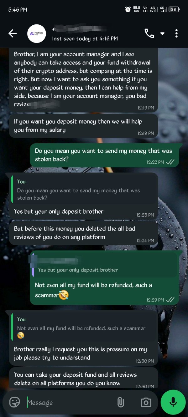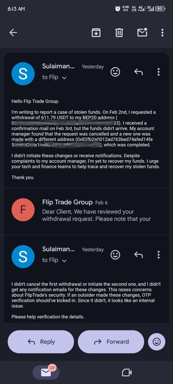 ⚠️ Beware of scam brokers! FlipTrade contacted me today, March 27, 2026, asking me to delete my review after blocking me when I sought help regarding funds stolen from my account since February 2, 2026. From our recent chat, it’s clear they indirectly admitted their platform is not secure, as unauthorized individuals were able to access my account and withdraw my funds. They are now offering to refund only my initial deposit, which I insist that all my stolen funds must be fully returned before I consider deleting my review. stay safe✌️