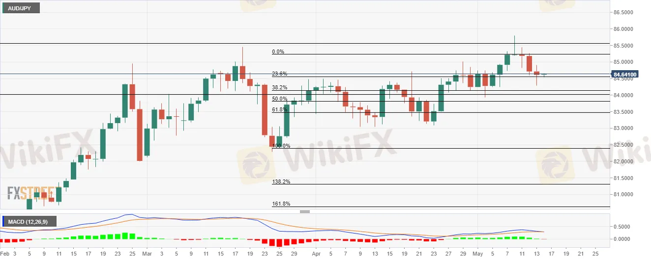 Balita sa Forex ng WikiFX (Ika-14 ng Mayo taong 2021) - Pagtatasa ng Presyo ng AUD/JPY : Ang mga bulls ay nagbabantay sa 38.2% Fibonacci retracement malapit sa 84.15.