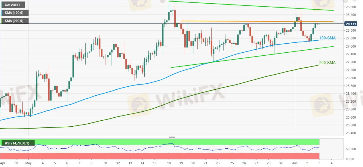 Balita sa Pananalapi ng WikiFX (Ika-3 ng Hunyo taong 2021) - Pagsusuri sa Presyo ng Pilak : Ang XAG/USD ay nakikipaglaban sa panandaliang pahalang na sagabal sa itaas na $ 28.00.