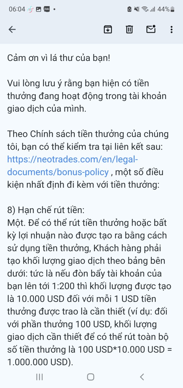 sàn neotrades lừa đảo tôi vừa mới nạp tiền sàn khóa không thực hiện lệnh chuyển tiền nội bộ, không thực hiện được lệnh rút tiền, và yêu cầu khối lượng lớn mới cho rút tiền vốn, tôi sẽ báo kiện công an làm việc với sàn neotrades văn phòng thành phố hồ chí minh.