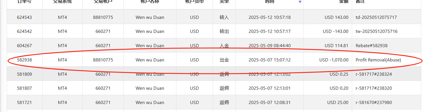 我自己开代理给自己的号加点,中间确认了三次以上加点是否加好了,得到肯定答复后做了30手后出金,浮盈200美金,入金1200出金金额1000,被平台拒绝,扣除1070美金,答复返多了,平台答应退还本金,后反悔,简直恶心人,退不了本金就算了,希望大家擦亮眼睛,不要在此黑平台做交易!!! 账号88810775