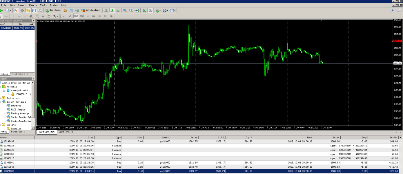 你好,我在10月4号上周五,我有4个单子,加起来共1.6手黄金单子,在领峰贵金属交易黄金,这4黄金单设置一样的盈利价位在1514.92(看图片1),在北京时间晚上20:30时过1-2秒左右,黄金市场价格和其他平台到达1515.63(看图片2)已经可以到达我的盈利价位,本应该盈利出场,可是领峰贵金属交易报价最高只有1511.97(看图片1),报价完全错误,和市场价格不对接,结果,我的单子没有盈利出场,导致在其他很低的价位出场,导致我的损失1280美元。和领峰贵金属沟通,他们坚定说他们平台价格没有错,说每个公司平台报价不一样属于正常,不予赔偿