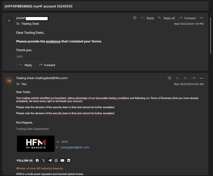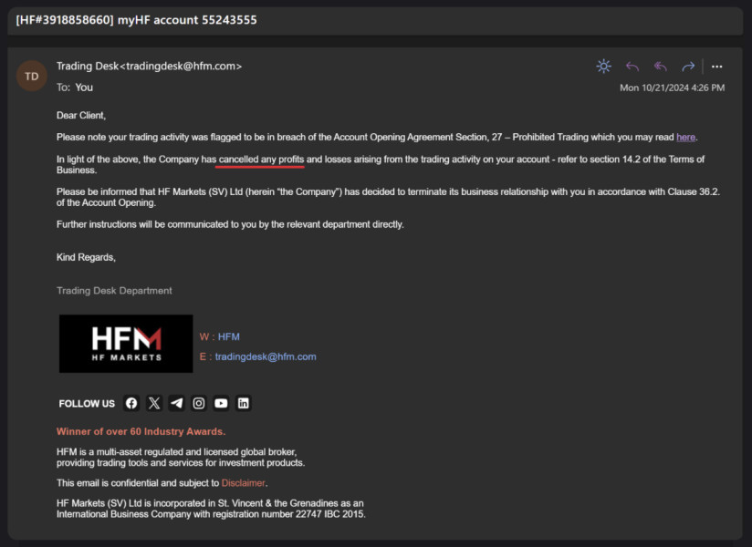 HFM sent me an email saying they cancelled ALL my profits. Because they claim I breached their Terms… They claimed I might be using "EA, Arbitrage, Snipping, or abusive trading strategy". However, I didn't use EA, Arbitrage/Snipping (all trades open >24hrs), and I don't know what is "abusive strategy" maybe they mean I make profit is abusive??? I replied to the Trading Desk, I asked them for evidence that I violated their terms. It is my right to see the evidence they used! They did not provide ANY evidence and simply replied that: "we have every right to terminate your account"... And they no longer reply to me, and they deleted my MT5 account completely.