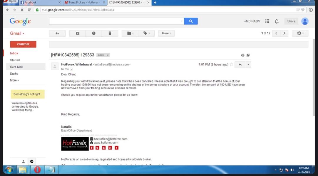 HFM is a fraud broker.It just cancelled my withdrawal request and say my bonus program has been changed and they cut 180$ from my money.what kind of a joke is this.they even don't send me a single msg that my bonus plan is changed nor they calle then how would i know that my bonus plan was changed?.they did not deduct the bonus when it was in the account.bt after i traded and loose the bonus they just send me mail containg "it is our mistake we forgot to deduct bonus now we cancelled your bonus and deduct money from it".i don't understand it is there mistake so why the hell they deduct their bonus from my own money.what kind of a policy is this.if they forget to deduct bonus from the account then it is there mistake they don't tell me that i can't trade with this bonus then why i have to pay for there mistake.i have all the screen shots to prove my point.i want justice from such fraud.