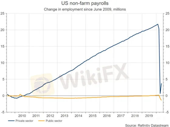 Selon les Nonfarm Payrolls publiés, au mois de juin, 3 millions d‘emplois auraient été créés et le taux de chômage aurait baissé jusqu’à 12,3%. Cependant, bien que ces 3 millions d'emplois signifie latteint du record de la croissance mensuelle, ils sont loin d'être le signal de la reprise en V.