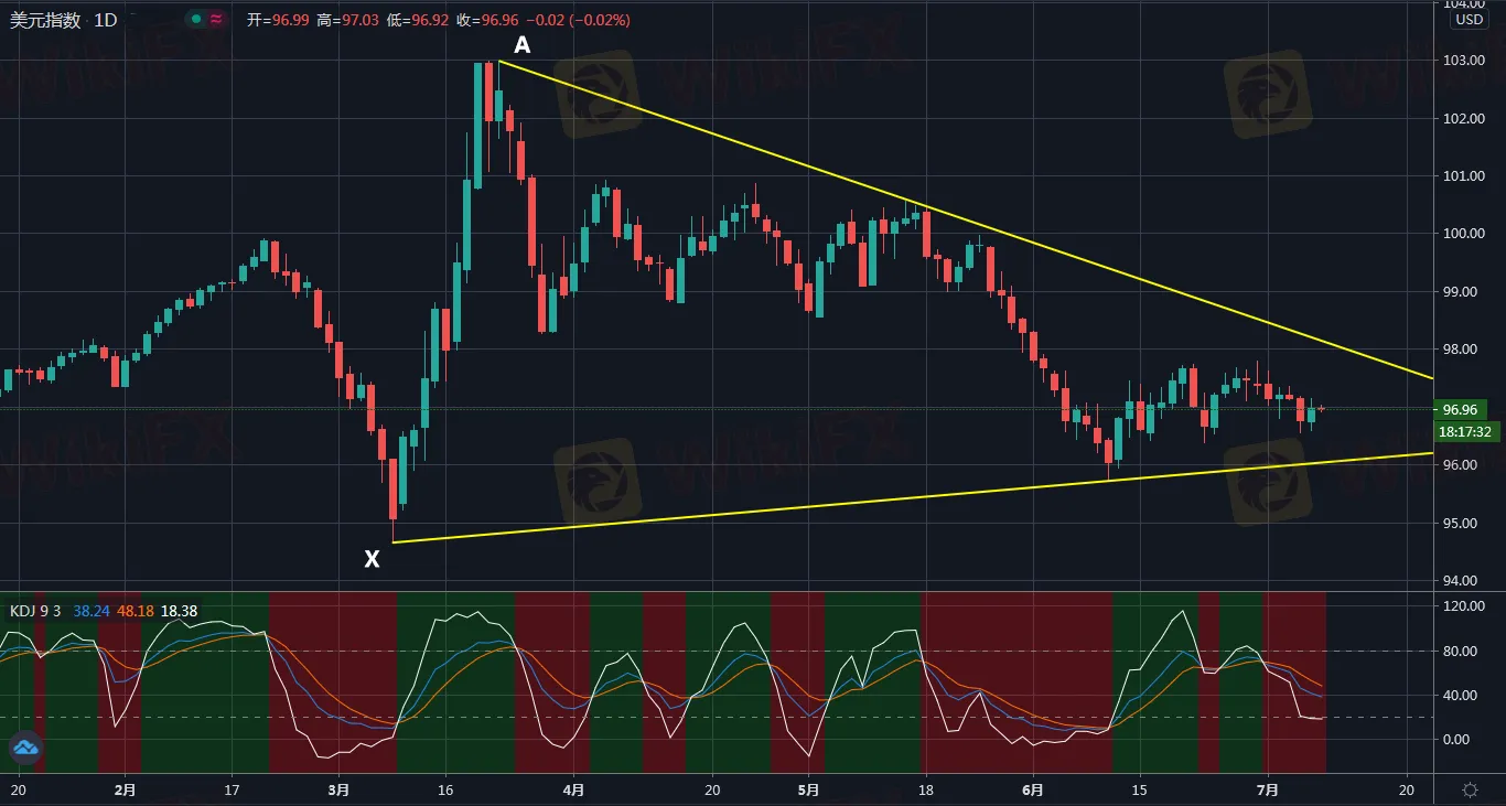 Ainsi, la figure de la diagramme journalière de l‘indice USD affiche que le prix USD rebondit légèrement après la baisse vers 95,72 au 10 juin. Actuellement le prix USD se situe dans un triangle convergent construit par la ligne de tendance baissière depuis le point A et la ligne de tendance haussière depuis le point X, s’agissant du point bas à 94,65 (le 9 mars), et fait face aux choix de son orientation : Si le prix tombait au-dessous du bord bas du triangle, sa baisse s‘aggraverait davantage ; S’il montait au-dessus du haut bord du triangle, il serait plus possible que son augmentation continue.