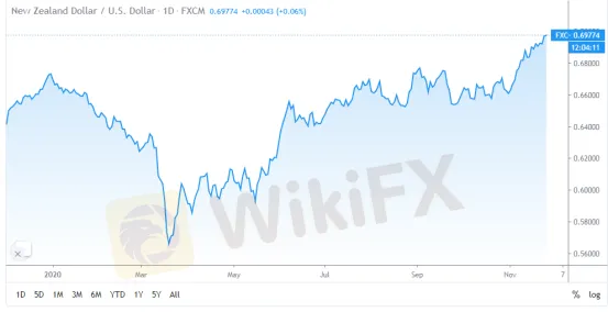 WikiFX News (samedi 28 novembre 2020) - Récemment, grâce à la baisse de la possibilité pour la RBNZ d‘appliquer les taux d’intérêts négatifs et au contrôle efficace de la pandémie en Nouvelle-Zélande, la paire NZD/USD pourrait enregistrer sa 4ème hausse hebdomadaire consécutive. Dans un moyen ou long terme, cette paire pourrait accueillir sa tendance haussière de plus grande envergure.
