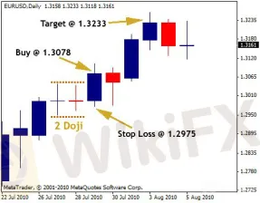 4. Si le prix de clôture du 3ème chandelier se trouve supérieur au haut des 2 dojis, placez une ordre d'achat, et configure le SL à 2 ou 3 pips au-dessous du bas des 2 dojis, ou à 2 ou 3 pips au-dessous du 3ème chandelier ;