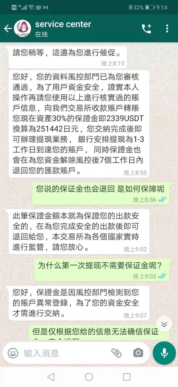 ALANFX平台结束交易后,上午申请提现。下午发现已经无法登录app账号,询问客服说是账户冻结。 先后要求证件照片,和账户资料进行身份认证。 认证后要求30%保证金。