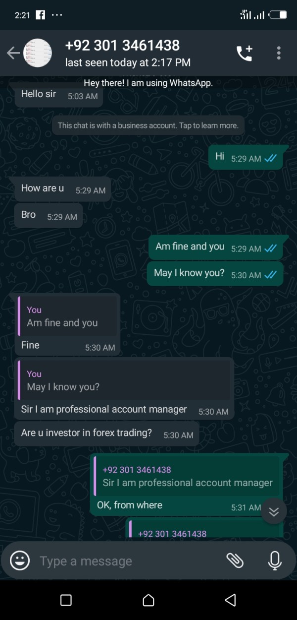 Somebody who claims to be from Pakistan messaged (Abdullahi Issa) from Nigeria and tried to lure him into paying $200-$500 to him, he claimed to be a professional account manager, he showed some pictures just to convince the trader but all was definitely to scam the trader.