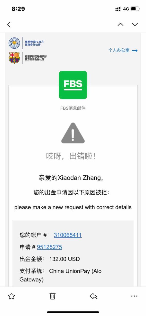 FBS平台网址是https://fx-fbs.cn,多次拒绝我的出金申请,哪怕我账户的资金只剩下132美金,他都会以各种莫须有的理由拒绝我,按照他们的意思就是填写当时入金的农行卡账号,农行卡开户行,他们都是一律拒绝。我转而通过SKRILL方式申请出金,他们又要我选择银联,我再次银联出金,他们又是拒绝。我要求平台马上毫无理由的给我剩下132美金都汇到之前的农行账户上去。