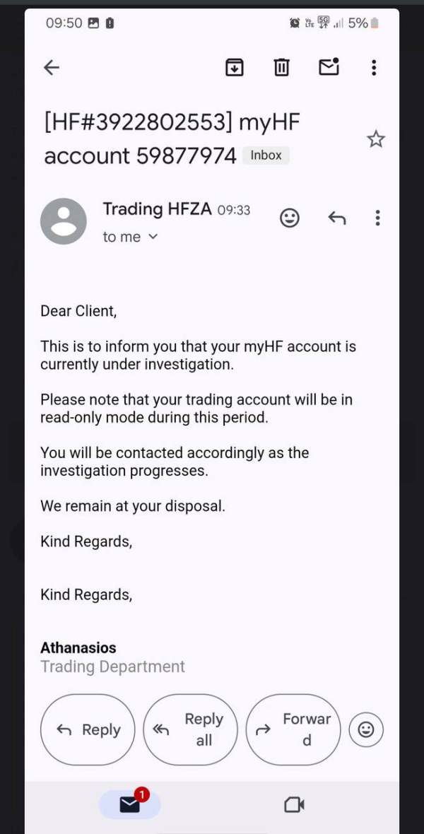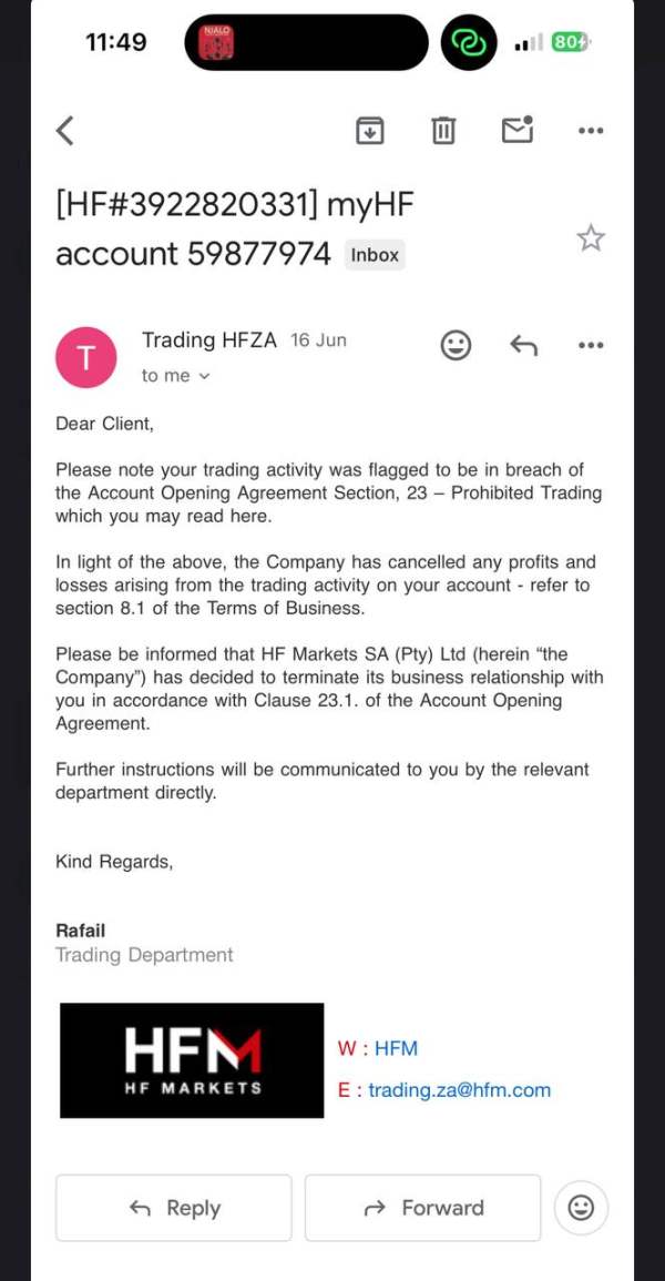 I'm extremely disappointed with HFM. After trading normally and making a legitimate profit of $19,000, my account was suddenly adjusted and the entire profit was taken away without any clear explanation. I followed the rules, I didn’t exploit any bugs or loopholes, and I traded within normal market conditions. What’s even worse is the lack of transparency—no detailed reasoning, no communication in advance, and no real chance to appeal or discuss the issue. If a broker can take away profits like this with no accountability, how can any trader feel safe using their platform?