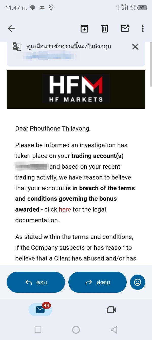 ผมได้ทำการเทรดมาเกือบจะปีกว่าเเล้ว ได้บ้างเสียบ้าง วันนี้โดนกล่าวหาว่าเทรดผิดเงื่อนไข , ผิดเงื่อนไขอะไรกัน? ออกออเดอร์เเค่ไม้เดียว .. สงสัยครับว่าผิดอย่างไร ... รู้สึกว่าเเย้มาก..เทรดก็เสียเยอะยังมาตัดโบนัสเเบบนี่ไม่ค่อย Fair เท่าไหร่. อยากทำอะไรก็ทำ ...เเบบนี้ก็ได้เหรอครับ