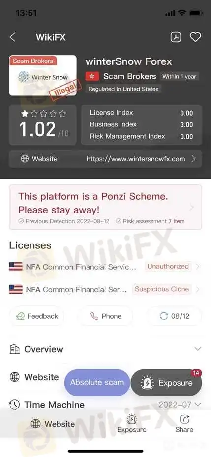 Winter Snow Limited एक ऑनलाइन विदेशी मुद्रा दलाल है जो ग्राहकों को विदेशी मुद्रा, स्टॉक, स्पॉट इंडेक्स, वायदा, कीमती धातुओं और वस्तुओं सहित कई व्यापारिक उपकरणों के सीएफडी उत्पादों की पेशकश करता है। हालाँकि, जैसा कि हम अब तक जानते हैं, यह दलाल विनियमित नहीं है और यह एक पोंजी योजना में शामिल हो रहा है। WikiFX ने Winter Snow Limited की गहन समीक्षा की और इस ब्रोकर के संपर्क नंबर और व्यवसाय पंजीकृत पते के बारे में कोई भी जानकारी प्राप्त करने में विफल रहा। इसके अतिरिक्त, WikiFX ने इस ब्रोकर को 1.02/10 की कम रेटिंग दी है और इसे WikiFX की स्कैम ब्रोकर्स सूची में सूचीबद्ध किया गया है। हम आपको याद दिलाते हैं कि इतने कम स्कोर वाले ब्रोकर में निवेश करना आपके फंड की सुरक्षा के लिए जोखिम भरा है।