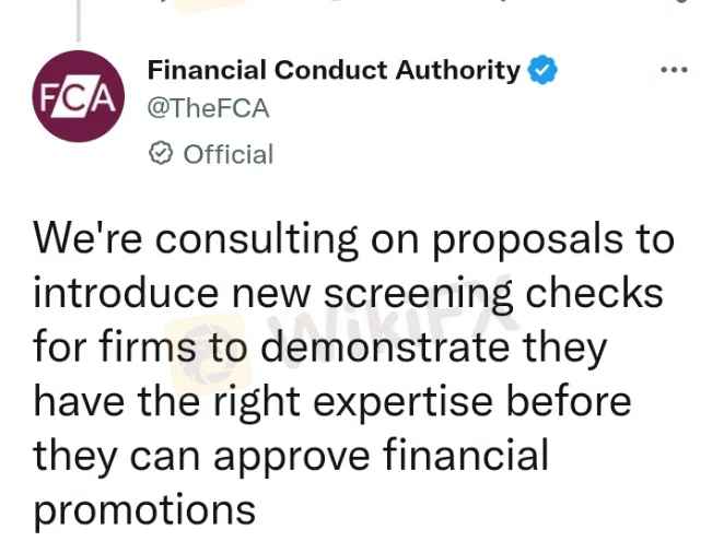 इसके बारे में जानकारी एफसीए ने अपने अधिकृत ट्वीटर अकाउंट से ट्वीट कर दी है। जिसमें उन्होंने कहा कि “हम फ़र्मों के लिए नए स्क्रीनिंग चेक शुरू करने के प्रस्तावों पर विचार-विमर्श कर रहे हैं ताकि यह निश्चित किया जा सके कि वित्तीय प्रचारों को मंज़ूरी देने से पहले उनके पास उचित विशेषज्ञता है”।