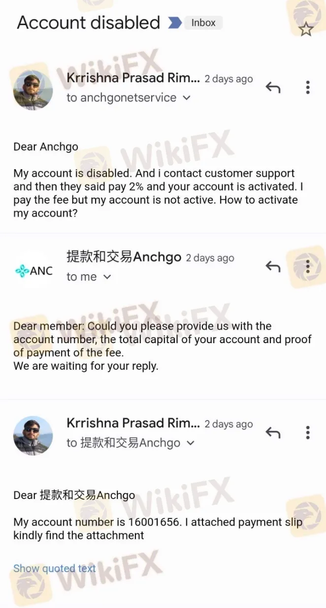 विकीएफएक्स पर ऐसे ही एक शिकायत दर्ज की एक ट्रेडर ने। उन्होंने बताया कि Anchgo नामक ब्रोकर पर उनका अकाउंट है जिस पर वह ट्रेडिंग करते हैं और पैसा कमाते हैं। लेकिन कुछ दिन पहले ही अचानक उनका अकाउंट Anchgo से डीएक्टिवेट कर दिया गया एवं उनके अकाउंट को फिर से चालू करने के लिए उनके मुनाफे का हिस्सा फीस के रूप में देने को कहा गया।