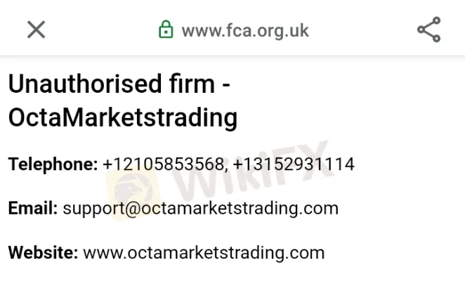 एफसीए के अनुसार यह ब्रोकर अधिकारिक रूप से यूके में वित्तीय सेवाएं प्रदान करने के योग्य नहीं है। साथ ही एफसीए ने बताया कि यह लाइसेंस धारक ब्रोकर भी नहीं है। अतः यह आसानी से आपके साथ ठगी कर सकता है। इससे आपको खतरा हो सकता है। एफसी द्वारा जारी की गई चेतावनी यह दर्शाती है कि OctaMarketstrading निवेशकों को अपने चंगुल में फंसा कर उनके साथ ठगी कर रहा है।nनिवेश करने के लिए ज़रूरी है कि आप किसी प्राधिकृत- भरोसेमंद ब्रोकर का चुनाव करें। जो आपको उत्कृष्ट ग्राहक सेवा प्रदान करने की गारंटी के साथ-साथ सभी नियम एवं शर्तों का भी पालन करें। विकीएफएक्स हिंदी आपको सचेत करता है कि विदेशी मुद्रा बाज़ार में हर जगह धोखाधड़ी है। अतः इन घोटालों से बचकर रहें।
