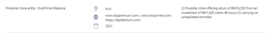 "इस खंड में अनधिकृत वेबसाइटों, निवेश उत्पादों, कंपनियों और व्यक्तियों की सूची शामिल है। इस सूची में शामिल हैं: अनुसूचित जाति से लाइसेंस के बिना निम्नलिखित विनियमित गतिविधियों को करने वाले या खुद को बाहर रखने वाले व्यक्ति: प्रतिभूतियों में व्यवहार करना; डेरिवेटिव में व्यवहार करना; कोष प्रबंधन; कॉर्पोरेट वित्त पर सलाह देना; निवेश सलाह; वित्तीय योजना; और निजी सेवानिवृत्ति योजनाओं में व्यवहार करना। प्राधिकरण के बिना एक मान्यता प्राप्त बाजार का संचालन करने वाले व्यक्ति। अनुमोदन, प्राधिकरण या मान्यता के बिना प्रतिभूतियों को जारी करने या पेश करने वाले व्यक्ति। अनुसूचित जाति के लोगो का दुरुपयोग करने वाले और अनुसूचित जाति को गलत तरीके से पेश करने वाले व्यक्ति। "संभावित क्लोन इकाई - DooPrime Malaysia N/A www.doppremium.com/, www.dooprimes.com, https://dpplatinium.com/ 2021 (i) संभावित क्लोन RM1,000 के निवेश से RM16,200 की वापसी की पेशकश 48 घंटे के भीतर (ii) अनियमित गतिविधियों को अंजाम देना