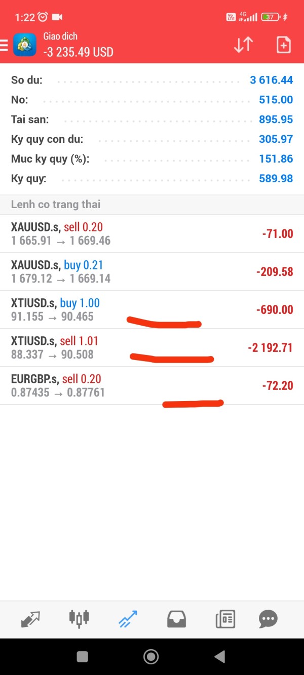 Ngày 07/10/2022 tôi có tham gia đầu tư vào sàn lion số vốn 1000 đô bonus 50,%,mt4 604843. Sàn cử chuyên viên Duyên tư vấn cho tôi. Với tài khoản 1500 đô em đã tư vấn cho tôi 4 đến 5 lệnh buy sell 0,2 đô tôi thắc mắc tại sao vào lệnh số vốn cao vậy thì bảo sàn kí quỹ thấp và may những lệnh đó cũng có lời..Trước giờ nofam thứ 6 ngày 7/10/2022 Duyên tư vấn cho tôi 6 lệnh với tổng số vốn mua bán 3,6 đô (trong khi đó tk tôi đã có lợi nhuận 1,100đô, tổng vốn 2.600 đô, trong đó 2 lệnh sell vàng 1,5 đô,2 lệnh buy dầu 1,5 đô,1 lệnh buy eur/usd 0,2 đô,1 lệnh sell gbp/usd 0,2 đô,eur/gbp 0,2 đô) Số vốn mua bán tại thời điểm nofam quá nhiều so số dư tài khoản của tôi 2600 đô là nhưng Duyên bảo kí quỹ thấp không sao, lúc giá thời điểm nofam biến động mạnh quá dường như tất cả các lệnh đang âm vốn mà không thấy tư vấn gì tôi chốt 2 lệnh eur/usd lỗ 88 đô và gbp/usd may lời 9.8 đô. Còn 2 lệnh sell cũng may có lợi nhuận chỉ 2 lệnh buy dầu lệnh buy 0,5 đô (88.990) 1,0 đô (88.489) trong khi đó thị trường dầu rớt giá xuống 88.045 thì Duyên bảo dầu giảm giá bảo tôi bán lại 1,0 đô tại vùng giá 88,337 đô vài phút sau dầu tăng lên lại bảo tôi chốt 2 lệnh buy dầu với lợi nhuận tầm 100 đô và tôi làm theo cứ nghĩ giá dầu tăng lên không cao nữa nên Duyên mới tư vấn tôi chốt lời vậy (vì tôi dính lệnh sell dầu 1,0(tôi đặt 1,01đô). Lúc đó giá tăng lên khá cao mà không thấy Duyên tư vấn gì tôi đã đặt thêm lệnh vì sợ cháy tài khoản (3 lệnh lợi nhuận khoảng 2000 đô) mà tài khoản tôi vẫn có nguy cơ cháy tôi đặt thêm lệnh buy 1,0 đô để cần lại thì trường và hiện trạng tài khoản tôi có nguy cơ cháy khi rút lệnh sell,buy dầu. Đầu tư tài chính là vấn đề khó khăn và ai cũng phải mắc sai lầm để thua lỗ tôi biết và chấp nhận nó nhưng khi sàn lion tại Việt Nam lại đưa chuyên viên thiếu kinh nghiệm thị trường để tư vấn cho tôi để tài khoản tôi giờ không biết mua bán gì được nữa. Tôi khiến nghị sàn bồi hoàn lại số vốn 1000 đô lại cho tôi và đổi chuyên viên tư vấn khác. Tôi xin cảm
