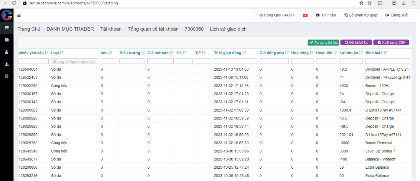 Sàn giao dịch CAPHOUSE ( https://caphouse.com/) lừa đảo không cho khách rút tiền. Tôi tham gia đầu tư khi đc bạn nhân viên hỗ trợ tên khánh ngọc vào tháng 02/11/2023, và tôi có nạp tổng 2 lần vs số tiền là 74tr750 nghìn đồng. Và đc bạn chuyên gia hỗ trợ mỹ vân hỗ trợ từ ngày 06/11/2023. Đến 14/11/2023 mình lời khoảng 31k và làm lệnh rút 20k xong không được phản hồi. Mình có nhờ chuyên gia hỗ trợ Mỹ vân hỗ trợ thì bạn ý yêu cầu là phải đóng 45% phí Bot, mình có yêu cầu trích thẳng từ tài khoản xong không được và mình báo ngay từ đầu mình không được phổ biến về phí bot nên yêu cầu bạn ý xin sàn hỗ trợ. Đến ngày 15/11/2023 bạn mỹ vân có trả lời là do mình ko biết nên sàn hỗ trợ giảm 5% và yêu cầu mình nạp 333tr660 nghìn để đóng phí bot. Mình có nhờ bạn khánh ngọc thì bạn ý bảo là đó là phí bot do anh và chị mỹ vân giao dịch em ko can thiệp được. Cũng khuyên mình nên nạp để rút số tiền trên. Do lúc cũng cần số tiền lớn mình vay mượn nộp để rút lợi nhuận kia ra. Đêm ngày 15/11/2023 có bạn gọi điện nói là nhân viên sàn caphouse phụ trách cân đối dòng tiền nói mình đi lệnh để cân đối dòng tiền xử lý lệnh rút tiền ban sáng. Khiến mình bị âm mất 13k. Mình vội cắt lệnh. Và yêu cầu hỗ trợ rút số tiền còn lại là 21k. Xong mình đặt lệnh từ ngày đêm 15/11/2023 đên hiện tại vẫn không được hỗ trợ. Hôm sau bạn mỹ vân thông báo là phải giao dịch thêm đủ số tiền ban đầu mới được rút hoặc nộp thêm 30% còn lại. Mình nhờ xin hỗ trợ nhưng ko được phản hồi. Viết mail lên sàn thì sàn báo liên hệ bạn hỗ trợ hoặc gọi lên tổng đài . Nhân viên hỗ trợ thì ko phản hồi. Gọi lên tổng đài thì trả lời qua quýt báo là lệnh tự động mất 24h đến 48h để xử lý. Nhưng hiện tại đến thời điểm giờ tôi vẫn chưa nhận đc tiền cũng nhưng bất cứ câu trả lời nào hài lòng từ sàn. Và không liên hệ đc bạn chuyên gia hỗ trợ mỹ vân cũng như khánh ngọc, đội nhóm mà lúc tôi tham gia đầu tư đều bị cho out khỏi nhóm. Cảm bị lừa. Bác nào đầu tư sàn Caphouse giống tôi không ạ .MỌI NGƯỜI CÙNG NHAU TẬP HỢP LÊN TIẾNG ĐỂ TẬP HỢP TỐ CÁO CÙNG MỘT LÚC Ạ.Anh chị em đang tìm hiểu thì nên suy nghĩ lại ạ và tìm hiểu kỹ ạ.