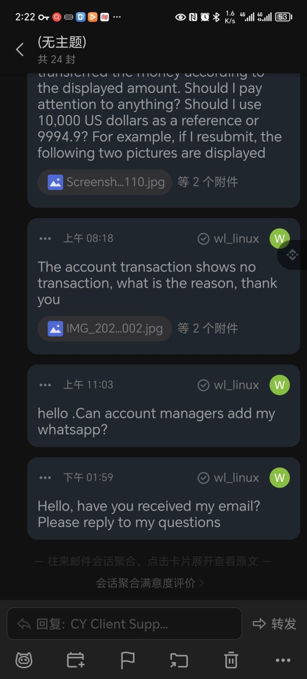 按客服要求入金10000美金,开通ecn账户,在我入金后并得到账号开始交易的时候,系统显示禁止交易,向客服邮箱发送多个邮件都无法得到有效回复。 I deposited 10,000 US dollars as required by the customer service and opened an ecn account. After I deposited the money and got the account to start trading, the system showed that trading was prohibited, and I could not get an effective reply when I sent multiple emails to the customer service mailbox.
