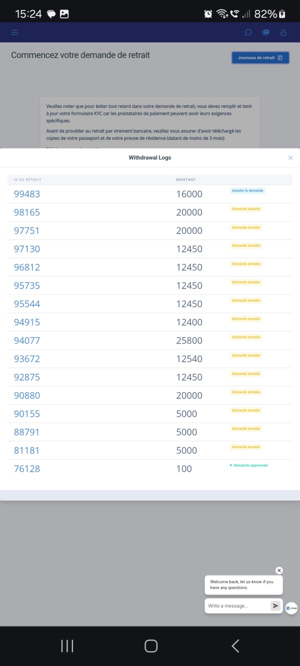 Je n'ai plus de placement en cours j'ai 16200€ sur mon compte j'ai demandé un retrait de 16000€ Vue que toute mes demandes quand j'avais 25815,29 € sur mon compte ils me les onts toujours refusé. Ont va voir ci il me accord. Thierry pellerin