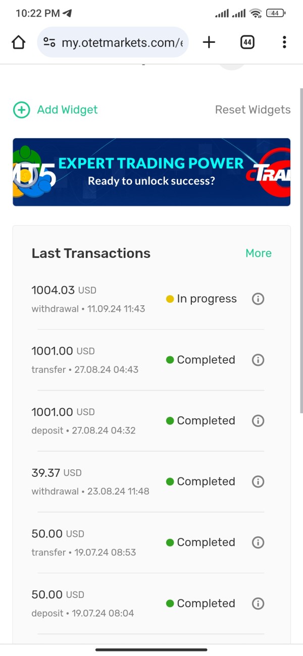 i was a new members of otetmarkets It is a scamm broker when i click to open 0.01 lots and now opened 1 Lot and i lost 30%of my money on the position After conversation otet team said you type mistake number But i have screen shot that show I don't typr e 1 lot i only open 0.01 lots And also now i can not withdraw my money i open a tacket with otet teams they said after 24 hr will complete it And now 30 H but he say please waiting...