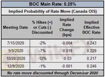Sejak akhir April, ekspektasi suku bunga pasar untuk Bank Kanada telah menurun. Mempertimbangkan kenaikan di pasar saham dan energi global, dolar Kanada sudah memiliki basis dukungan yang lebih banyak. Saat ini hanya 1% bahwa bank sentral diperkirakan akan memotong suku bunga sebesar 25 basis poin dengan 212.