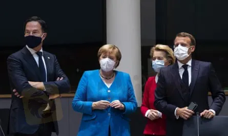 Setelah kebuntuan hari kedua, Angela Merkel dan Emmanuel Macron keluar dari pembicaraan tengah malam dengan para frugals - sebuah tampilan persatuan oleh pasangan Franco-Jerman, yang pertama kali mengusulkan dana pemulihan besar-besaran yang ditopang oleh pinjaman Uni Eropa yang melanggar tabu yang dipinjam di pasar keuangan untuk menarik Uni Eropa keluar dari resesi terburuk dalam sejarahnya.