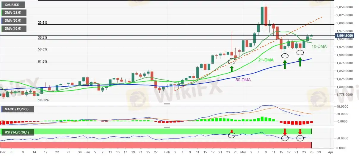 Setelah itu, level DMA-10 dan Fibonacci retracement 50%, di dekat $1.938 dan $1.912 akan menantang penjual emas.