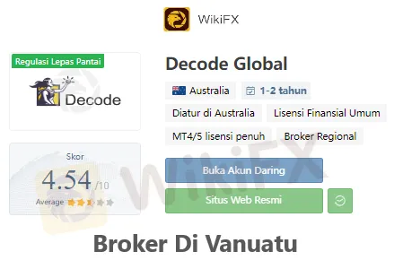 Decode Global adalah broker atau pialang berjangka yang berada di negara Vanuatu. Perusahaan ini terdaftar di 2 lembaga regulator dengan referensi berikut ini: