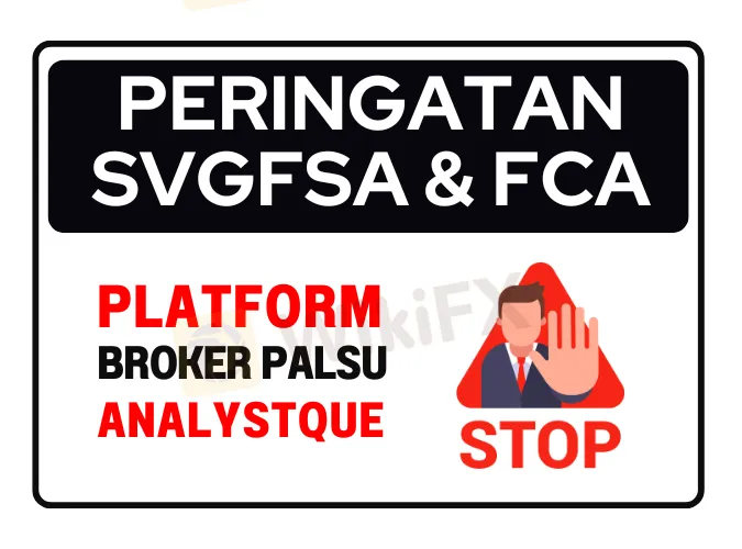 Otoritas Jasa Keuangan St. Vincent dan Grenadines (“Otoritas”) memberi tahu masyarakat bahwa entitas bernama Analystque TIDAK terdaftar di St. Vincent dan Grenadines. Menurut FCA – Financial Conduct Authority – Inggris, Analystque diyakini menyediakan layanan atau produk keuangan di Inggris tanpa izin mereka.