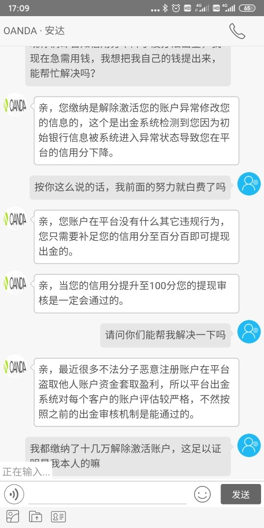从7月份开始在微信朋友圈介绍说做外汇交易,还会派一个专门带单的人操作,说稳赢百分百盈利,跟着入金6万5千,盈利后账户余额显示68万多,没过两天说平台升级需要重新注册一次,提供资料匹配完成也没有问题,然后提现很久也没有到账就联系客服,就说我的银行卡信息错误导致出金被驳回,当初我提供资料的时候已再三确认信息是正确的,要求我缴纳账户总额的百分之二十才能解除异常,我又交了13万多重新修改银行卡信息,后来说平台再次升级,之前的app已经无法登录了,又让重新下载了app是OANDA(安达),把所有信息转过去后提现还是无法出金,这次说的是信用分只有80分不足,必须要达到100分,还得让我缴纳10万才能提现,累计本金已经套进去20万了,请求平台出面帮忙解决。
