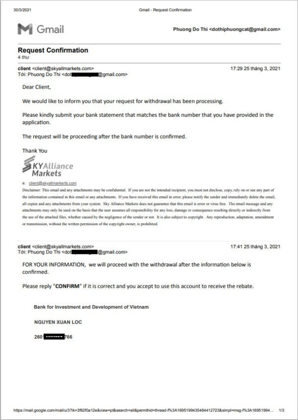 Mình là Lộc, làm IB cho Sky Alliance Markets. mình đã làm lệnh rút tiền từ 07/03/2021 số tiền 953,7$ nhưng không có động thái gì từ Sky cả. Đến ngày 20/03/2021, mình gửi email cho Sky hỏi về khoản tiền này thì 5 ngày sau (25/03/2021) nói là phải upload lại sao kê ngân hàng, mình ra lấy ngay và gửi lại Sky, làm theo yêu cầu. Tuy nhiên, đến nay 30/03/2021, mình vẫn chưa nhận được tiền hay email gì trả lời từ Sky cả.