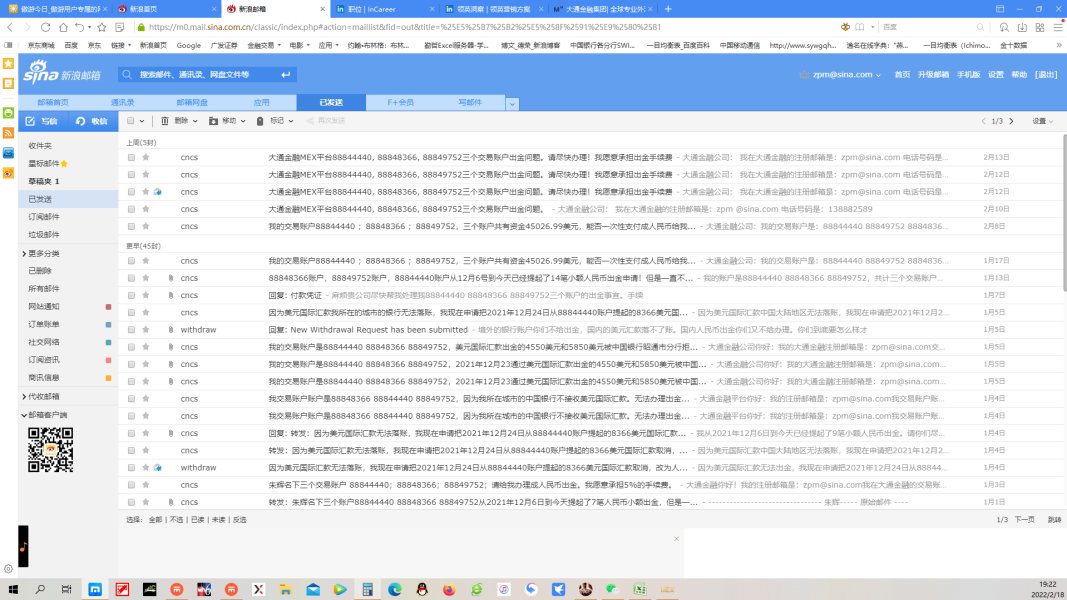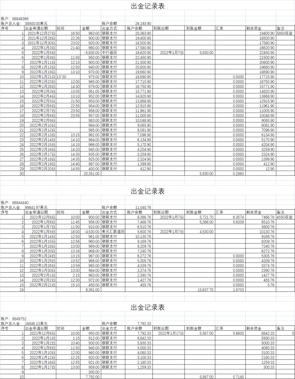我在大通金融集团的账户为:88844440 ;88848366;88849752。我前前后后入金了将近一百万人民币。自从2021年11月开始,就一直不给出金。2021年11月1日从88848366账户出金7500美元。一直拖着,拖到11月15号退回账户。然后说不允许人民币出金。只能美元出金或者1000美元以下小额人民币支付出金。我就不停的申请1000美元以下小额人民币出金。到今天已经申请了40多笔。但是一直不给我办理打款。我也在2021年11月开始就不停的跟大通官网在线客服勾通,协商出金。但是三个多月时间过去了一直不给出金。每次跟客户勾通,都说在给我加急办理。但是一直没有收到打款。我现在三个账户里一共还有44076.99美元(分为:88844440账户11040.76美元;88848366账户26193.9美元;88849752账户6842.33美元)。我前前后后在大通金融交易账户入金了将近100万人民币交易。也没赚到钱,现在账户里剩下的也都是我的本金。我就跟大通金融商量,把我账户里剩下的资金通过人民币支付方式出金给我,因为我所在的城市的银行不接收美元汇款落账,我也在2022年1月5日将银行退回美元汇款的回执单发送给了大通,大通金融告诉我说可以申请小额人民币出金(单笔1000美元以下)。我把截止今天的账户余额,发送邮件要求出金的记录上传作为证据,希望引起大通的注意,远离大通金融这种骗子公司。大通金融就是看大家是否能团结起来。要不然我们的资金就要被大通金融黑吃了。也在这里发布一下大通金融的恶劣行为。让做外汇的朋友再也不要上大通金融公司的当。远离它。
