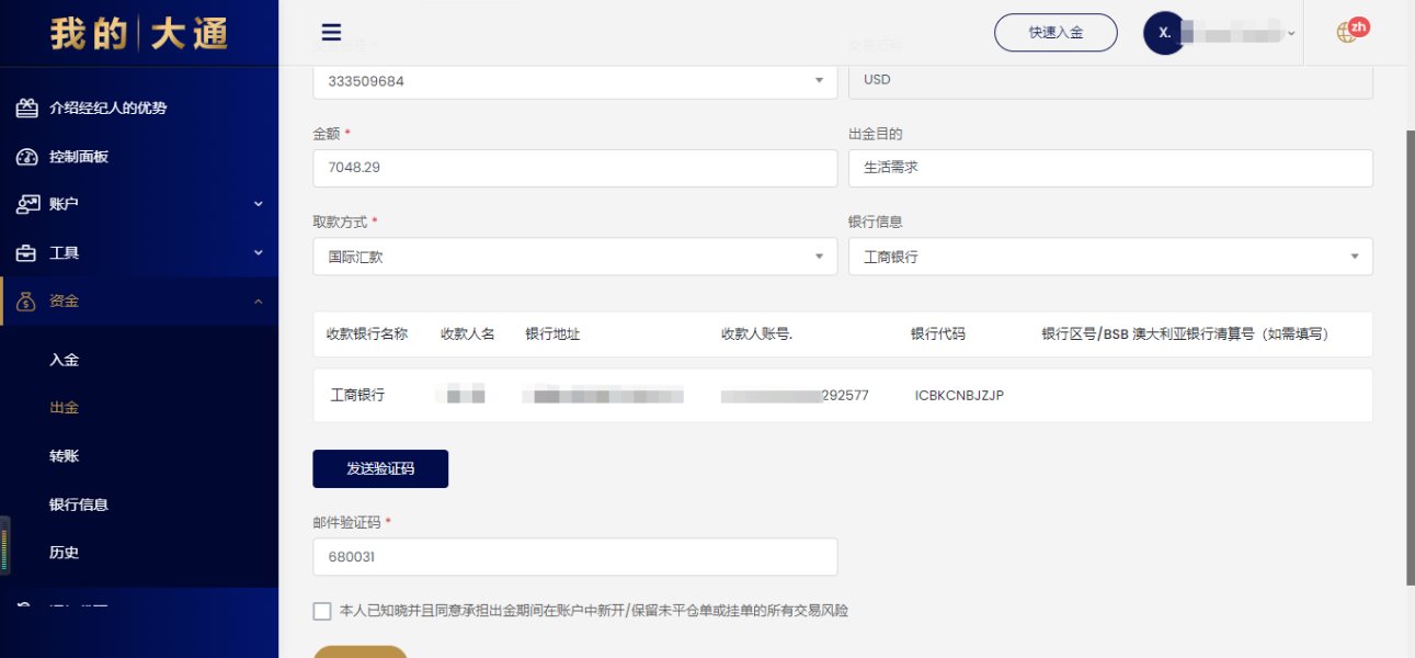 我已经申请了好几次出金 最后结果就是资金还是卡在帐户里根本就没有要通过我的请求意思我不断的申请 在申请还是一样 就是卡在这无限循环 请天眼帮我维权帮助我 真的不知道该怎么办了 两个账户共两万多美金
