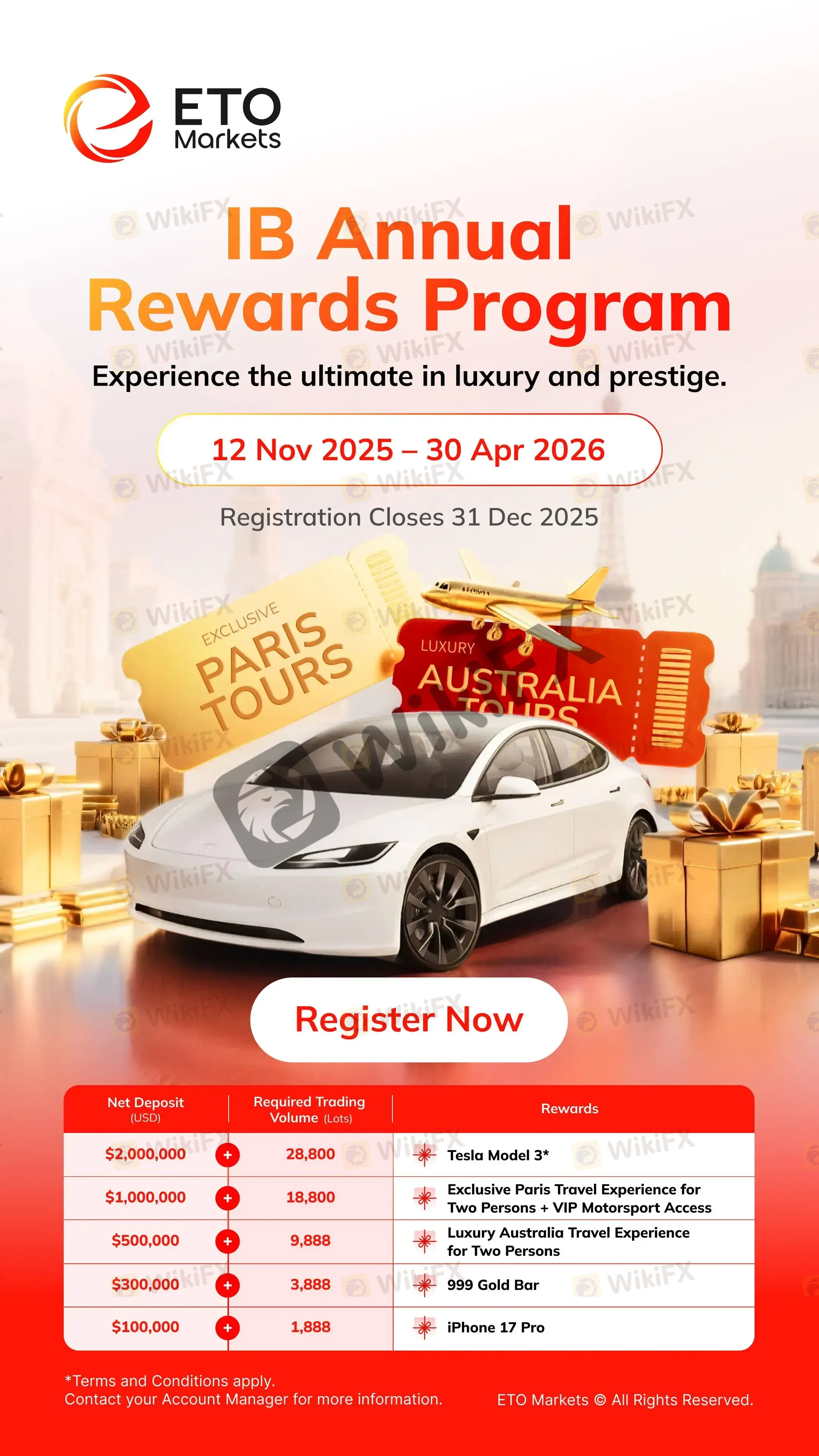 Celebrate excellence. Reward ambition. Success deserves recognition, and at ETO Markets, every milestone is worth celebrating. The 2025 IB Annual Rewards Program is designed to honor our partners who lead with vision and performance. It is more than a reward initiative; it represents our shared pursuit of growth, trust, and achievement. ETO Markets invites all IB (Introducing Brokers) to join a journey of prestige and opportunity, where dedication turns into distinction and every trade brings you closer to extraordinary rewards.