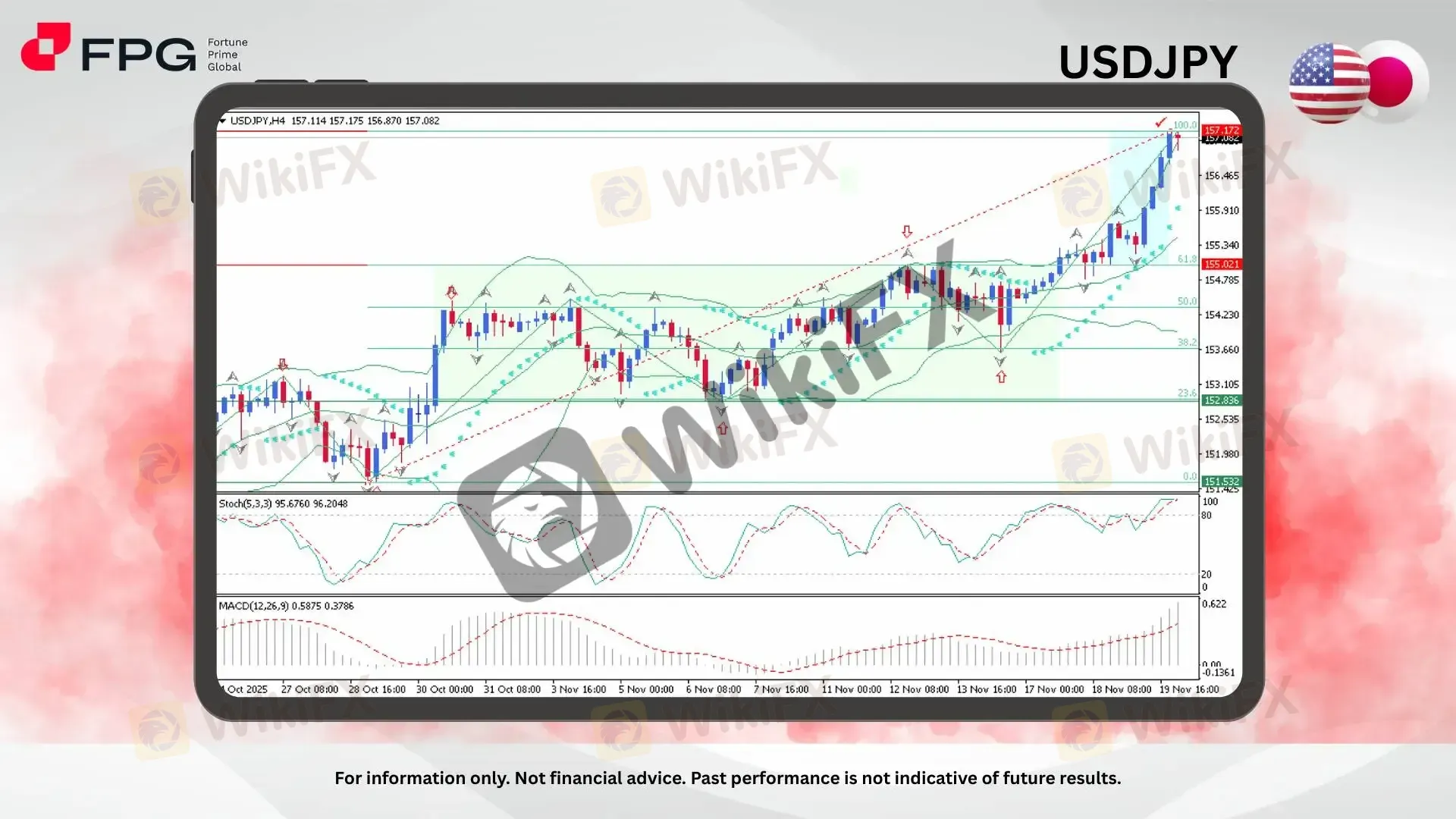 Momentum indicators are showing early signs of overextension. The Stochastic Oscillator (5,3,3) is deep in overbought territory, hovering near extreme levels, suggesting potential exhaustion. Meanwhile, MACD shows steady histogram expansion, confirming that buying pressure remains active, though a slowdown in momentum could trigger a temporary correction phase. This setup places USDJPY at a decisive point, likely to either push through 157.17 for continuation or pause for correction.