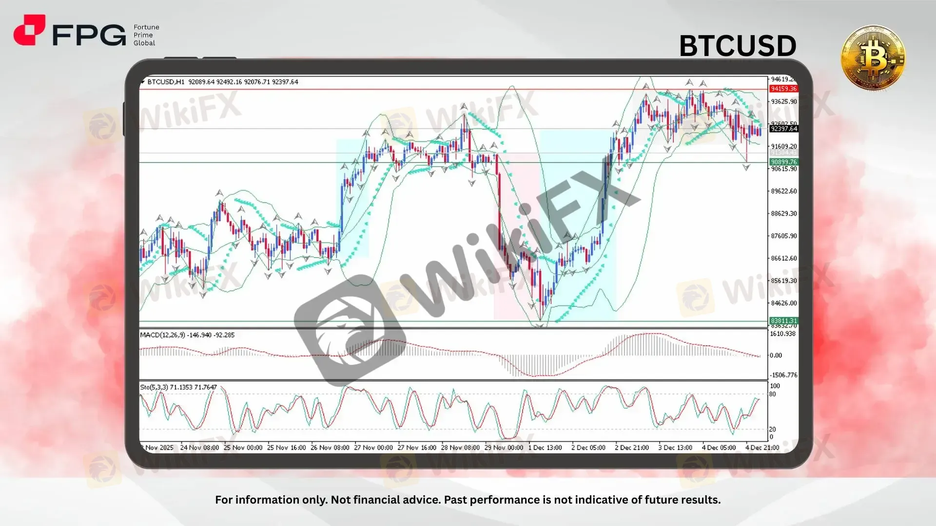 BTCUSD previously experienced a sharp decline from 91,304 down to 83,811, followed by a strong and rapid recovery that lifted the price back toward the 92,350 region. After this V-shape rebound, the market has transitioned into a more neutral phase, with the current price oscillating in a relatively tight range around 92,397. This sideways movement suggests that buyers and sellers are now in temporary equilibrium as the market waits for clearer directional cues.