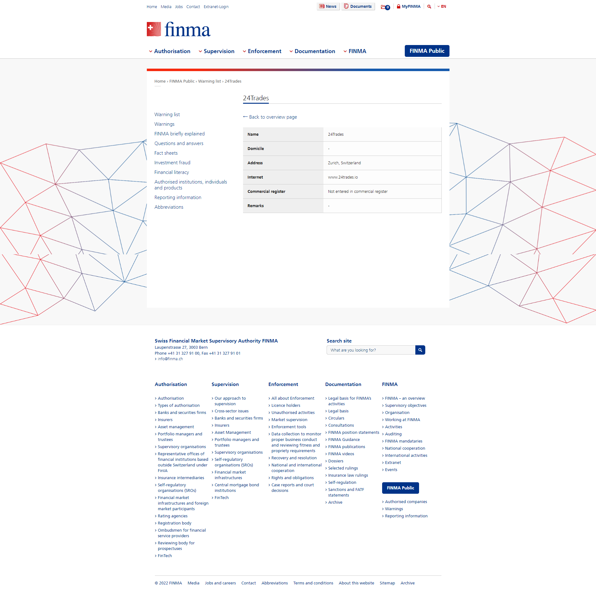 "L’autorità svizzera di vigilanza sul mercato finanziario (FINMA) è un’autorità indipendente di regolamentazione del mercato finanziario.FINMA è responsabile della vigilanza delle banche, delle compagnie di assicurazione, degli scambi, dei commercianti di titoli, dei sistemi di investimento collettivo e delle società di gestione patrimoniale e delle società di gestione dei fondi.Inoltre, FINMA supervisiona anche i distributori e gli intermediari assicurativi. La FINMA ha la responsabilità di proteggere i diritti e gli interessi dei creditori, degli investitori e degli assicurati, garantendo nel contempo il funzionamento efficace del mercato finanziario svizzero. "
