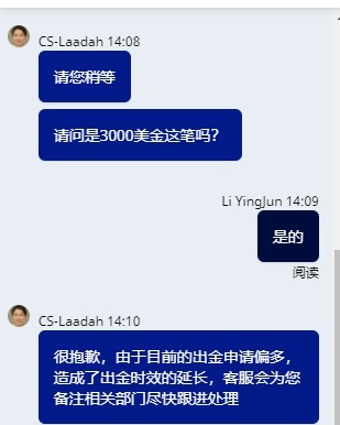 私は約1ヶ月間撤退を申請していますMultiBank Group、しかし、それは撤回することができませんでした。取引口座番号:33514820引き出し金額:USD 3000引き出しの申請日は、2022年1月10日です。これまでのところ支払いはありません。カスタマーサービスに連絡するたびに返信が処理されていますが、進捗状況は不明です。当初の計画は、新年の前に支払うことができるようにすることでした。今、旧正月は終わりに近づいています。