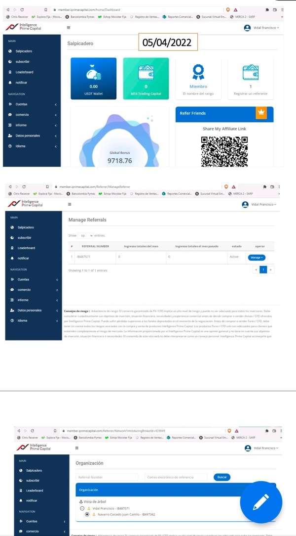 Estimados IPC Agradezco amablemente dar prioridad a los siguientes casos, los cuales se encuentran impactados por los sucesos informáticos del pasado mes de marzo. En reiteradas ocasiones hemos enviado un correo a la dirección enquiry@iprimecapital.com con el asunto "Request_IPC_Francisco Vidal" desde el pasado 05/04/2022 exponiendo el detalle del caso y a la fecha no se ha recibido ningún tipo de repuesta o confirmación. Se requiere actualización de Fondos en la Wallet Azul y en la cuenta de MT4 ya que estos aparecen $0 actualmente. Esto con el objetivo de poder disponer de los fondos con normalidad. Mis datos son: ID Referido: IB487571 ID MT4: 4422658 Nombre: Francisco Vidal ID: 1111796525 Total Saldo Disponible en Wallet Azul: $105.899 al 02/04/2022 Total Saldo Disponible en MT4 ID 4422658: $110.10 al 02/04/2022. *Línea de Auspicio: ID Referido: IB222726 ID MT4: 2940654 Nombre: Brayan Diaz ID: 1111796670 *Línea de Referido: ID Referido: IB497342 ID MT4: 4433918 Nombre: Juan Camilo Navarro Caicedo Total Saldo Disponible en Wallet Azul: $111.144 al 02/04/2022 Total Saldo Disponible en MT4 ID 4422658: $1000.10 al 02/04/2022 Gracias Cordialmente Francisco Vidal
