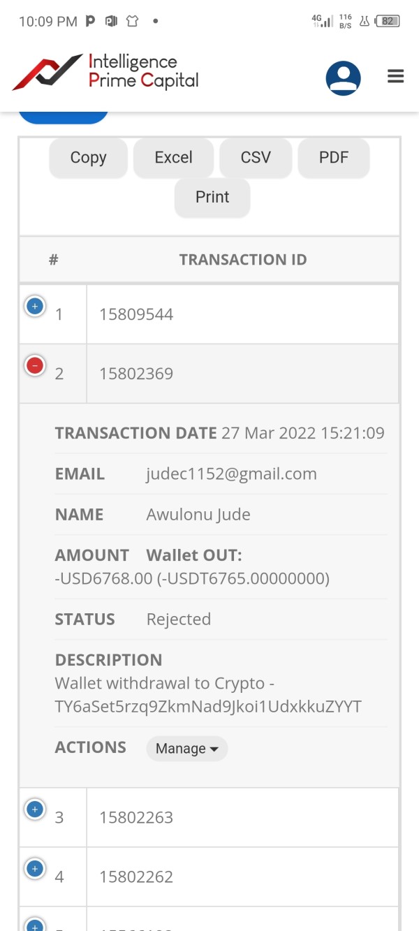 Withdrawal Rejected: My Name is AWULONU Jude Chukwunyere. I'm an investor in IPCAPITAL, with trading account Number 2800716 I place withdrawal in USDT TRC 20 to my Binance wallet address (TY6aSet5rzq9ZkmNad9Jkoi1UdxkkuZYYT) of $1,943 on 20th of March; $277 on 22nd of March and $6,768 on 27th of March 2022 respectively and all were REJECTED. None were paid; None reflected back to my IPCAPITAL dashboard nor my MT4 account. I hereby appeal for urgent approval of my withdrawals to the wallet address provided above. I expect a positive and swift response. Best Regards.